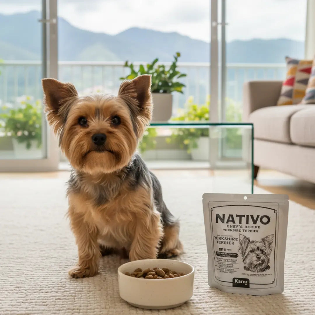 El Alimento Húmedo Nativo Chef’s Recipe Yorkshire Terrier Kanu Pet para Perros está formulado especialmente para el cuidado nutricional de perros Yorkshire, apoyando su piel, pelo sedoso y digestión sensible. Elaborado con pollo (25%) y carne de res (20%), aporta proteínas de alta calidad que favorecen la salud muscular y mantienen la energía diaria. Incluye aceite de salmón, aceite de oliva y chía, fuentes naturales de omega 3 y 6, esenciales para un pelaje brillante y piel sana, característica clave del Yorkie.