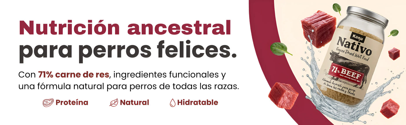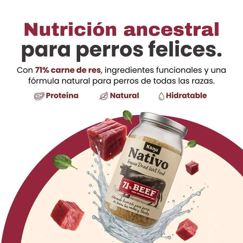 Kanu Pet Nativo Freeze Dried Wet Food de Res es un alimento húmedo liofilizado 100% natural para perros de todas las razas, a partir del destete. Gracias a su proceso de liofilización (freeze dried), conserva intactos los nutrientes, la frescura y el sabor real de la carne de res, ofreciendo alta palatabilidad y una excelente digestibilidad, incluso para perros con estómago sensible.
