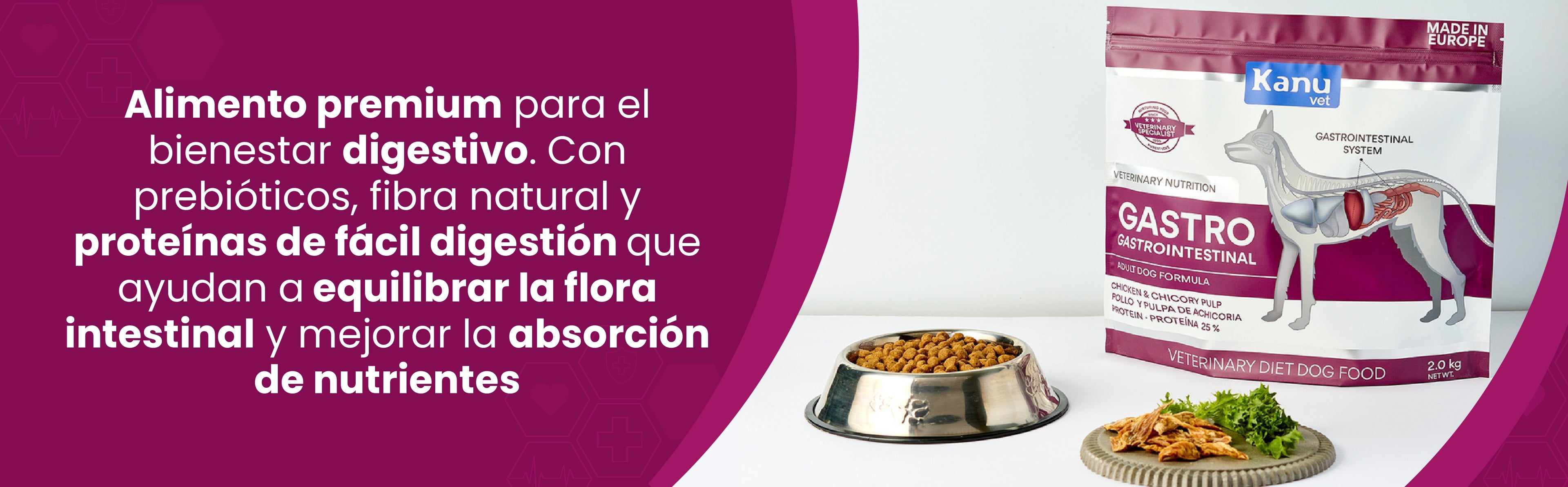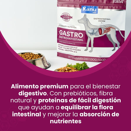 Kanu Vet Gastrointestinal es un alimento formulado específicamente para perros adultos con sensibilidad digestiva. Su fórmula especializada combina proteínas de pollo deshidratadas y pulpa de achicoria, ofreciendo un óptimo soporte gastrointestinal.