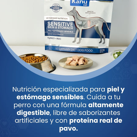 Kanu Vet Sensitive Skin and Stomach es un alimento completo para perros adultos, formulado especialmente para perros con piel y estómago sensibles. Su fórmula exclusiva con proteína de pavo deshidratada, arroz, guisantes y fibra vegetal favorece una digestión saludable y apoya la salud dérmica de tu mascota.