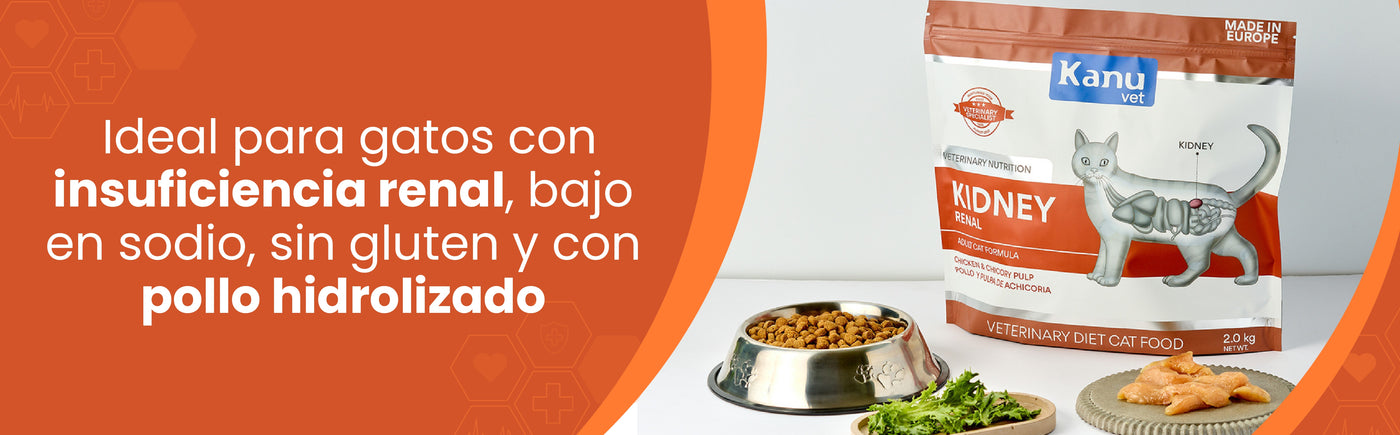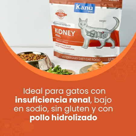 Kanu Vet Renal es un alimento premium formulado específicamente para gatos con necesidades renales. Su fórmula contiene pulpa de achicoria y aceite de algas, ingredientes conocidos por sus beneficios para la salud renal y por apoyar el bienestar general de tu gato.