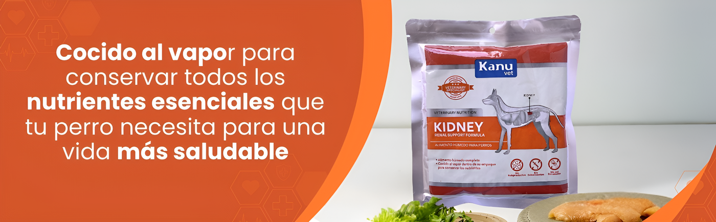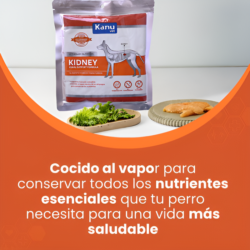 Alimento Medicado Húmedo Kanu Vet Renal - Kidney para Perros Adultos es un alimento formulado por especialistas para apoyar la salud renal de tu perro. Su fórmula cocida al vapor conserva los nutrientes esenciales, favoreciendo una digestión óptima. Elaborado con ingredientes naturales, este alimento está libre de subproductos, saborizantes artificiales, sal y azúcar, garantizando una nutrición de alta calidad y saludable para tu perro.