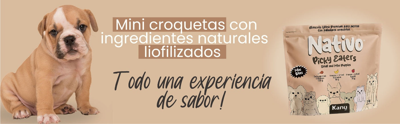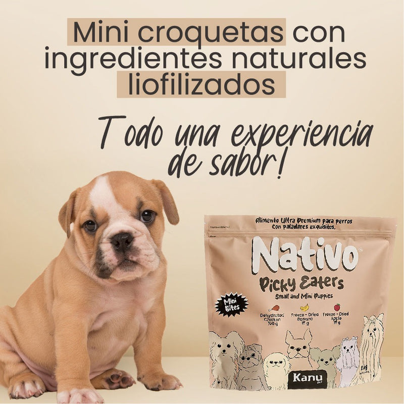 Nativo Picky Eaters Puppy de Kanu Pet es un alimento ultra premium diseñado especialmente para cachorros de razas pequeñas y miniatura, con paladares exigentes. Elaborado con pollo deshidratado, banano y manzana liofilizados, proporciona una nutrición balanceada para un crecimiento saludable, sin gluten, saborizantes artificiales ni sal. Su fórmula de alta calidad asegura que tu cachorro reciba los nutrientes esenciales para un desarrollo óptimo, mientras satisface su paladar con sabores naturales y deliciosos.