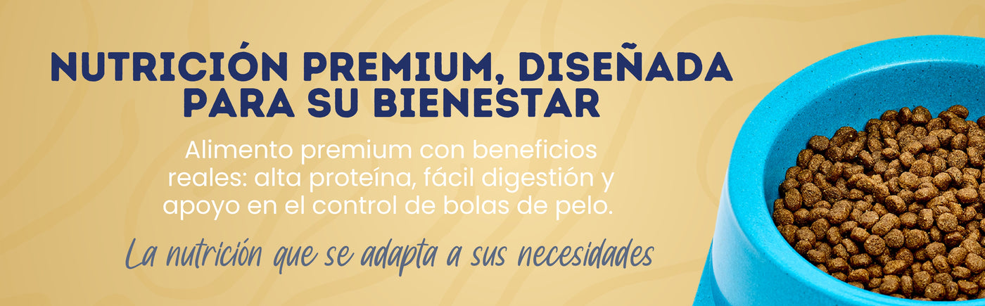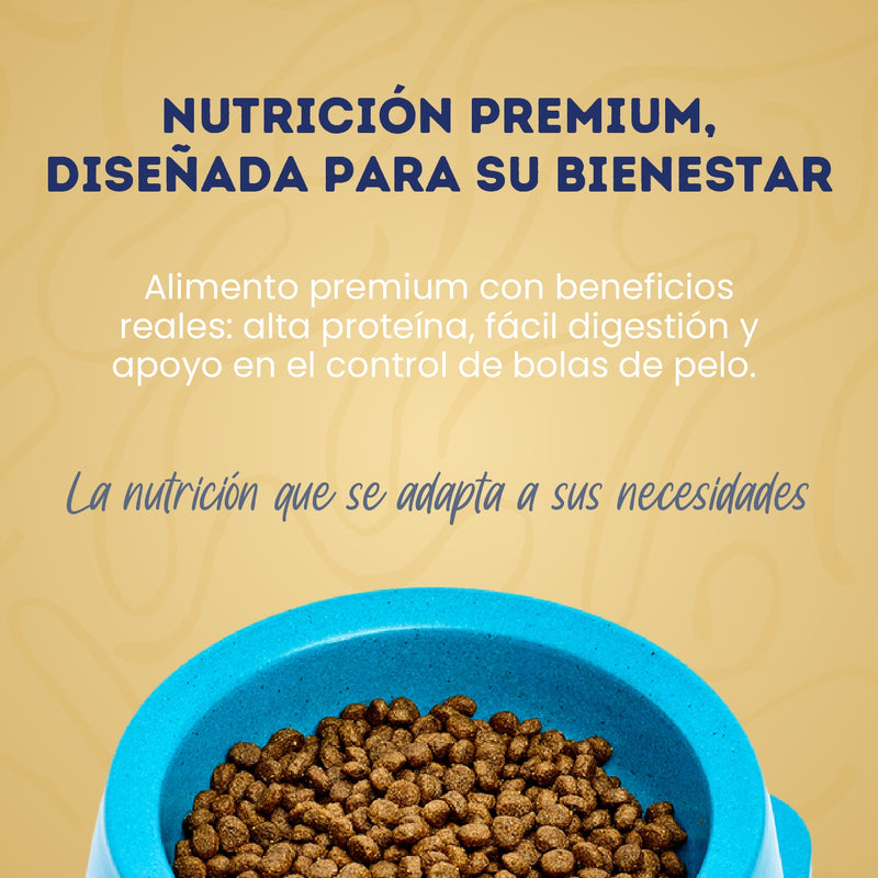 Su fórmula está pensada para mantener el bienestar general de tu gato, ayudando a reducir la formación de bolas de pelo y promoviendo un pelaje brillante y saludable.