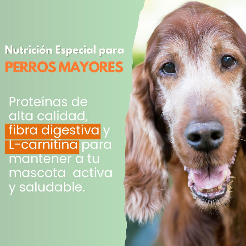 Su fórmula está diseñada para apoyar el bienestar general, la salud digestiva y el mantenimiento muscular en los perros mayores, asegurando que se mantengan activos y saludables a lo largo de los años..
