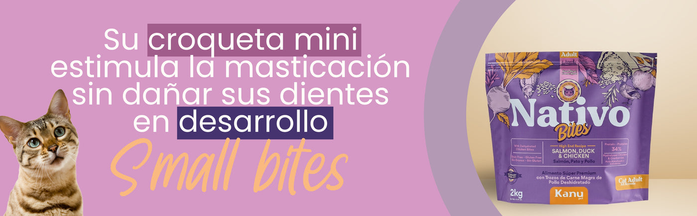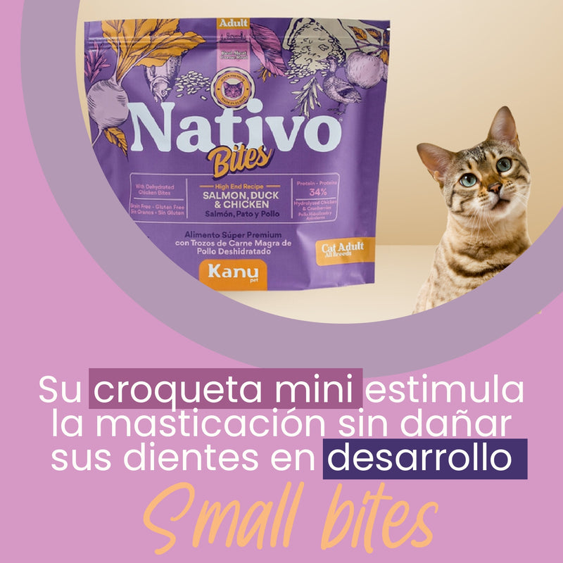 Alimento Seco Nativo Bites Salmón, Pato y Pollo de Kanu Pet para Gato Adulto es un alimento súper premium formulado para gatos adultos de todas las razas. Elaborado con proteínas de alta calidad de salmón, pato y pollo, este alimento incluye trozos de carne magra deshidratada que garantizan un sabor irresistible.