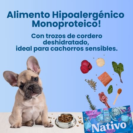 Kanu Pet Nativo Bites es el alimento ideal para cachorros de razas medianas y pequeñas. Formulado con proteína de cordero y trozos de carne magra de cordero deshidratado, este alimento súper premium asegura que tu cachorro reciba todos los nutrientes esenciales sin la necesidad de maíz ni gluten. Además, contiene manzanas secas y achicoria seca, que favorecen una digestión saludable.