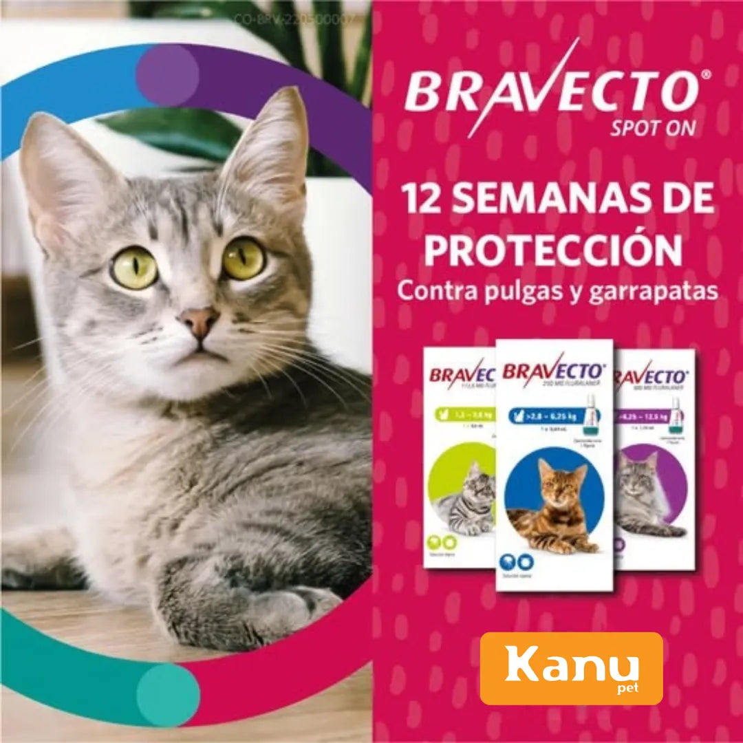 Bravecto solución tópica para gatos de 2,8 a 6,25 kg es un tratamiento de larga duración que combate pulgas adultas y garrapatas con una sola aplicación. Su ingrediente activo, Fluralaner, penetra la piel y se distribuye por el organismo para ofrecer protección continua durante hasta 3 meses. El producto elimina rápidamente las pulgas, reduce la probabilidad de reinfestaciones, y aporta comodidad al tutor al evitar tratamientos mensuales. Es ideal para gatos que viven dentro y fuera de casa, con exposición a parásitos externos persistentes.