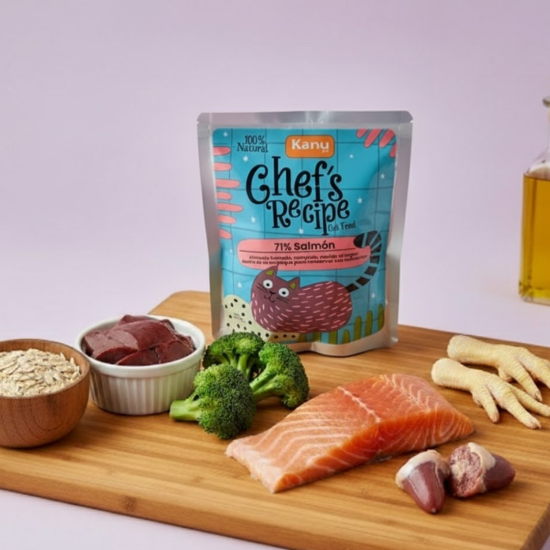 El Combo Chef’s Recipe Salmón x7 para gatos ofrece una dieta alta en proteína natural de salmón, sin rellenos ni saborizantes artificiales. Ideal para quienes buscan alimento saludable para gatos adultos con ingredientes reales cocidos al vapor, que mejoran la digestión, piel y pelaje brillante con el auténtico sabor del mar.
