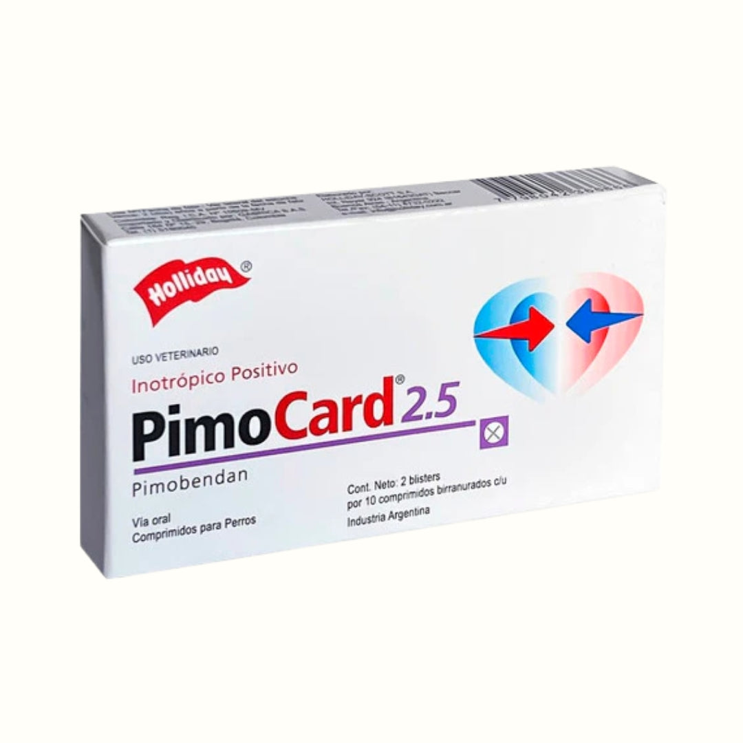 PimoCard 2.5 mg es un comprimido oral veterinario cuya acción es inotrópica positiva y vasodilatadora periférica, indicado para perros con insuficiencia cardíaca congestiva tipo C y cardiomiopatías dilatadas. Mejora la fuerza de contracción del corazón, reduce la resistencia vascular, disminuye los síntomas como la dificultad respiratoria, intolerancia al ejercicio y las acumulaciones de líquido, prolongando la calidad de vida del perro.