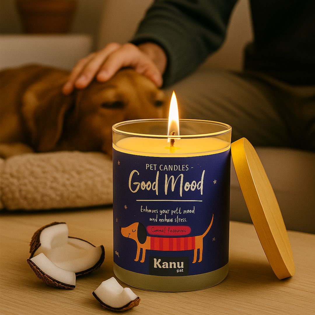La Vela Good Mood Kanu Pet para Perros es un producto natural de aromaterapia ambiental formulado para ayudar a tu mascota a sentirse más tranquila, animada y equilibrada. Gracias a su aroma tropical a coco (Coconut), esta vela transforma el ambiente en un espacio positivo y armonioso, ideal para perros que presentan apatía, decaimiento emocional o estrés leve.
